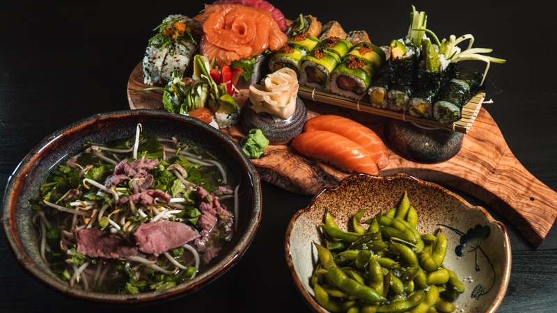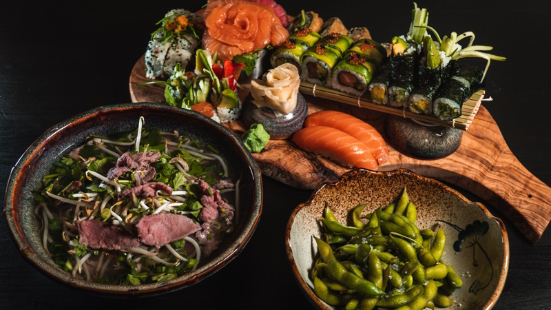 Mit hausgemachter vietnamesischer Brühe, die mit Kräutern, Sojasprossen und Reisbandnudeln serviert wird.