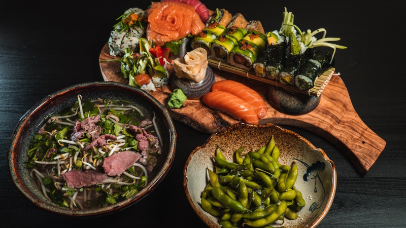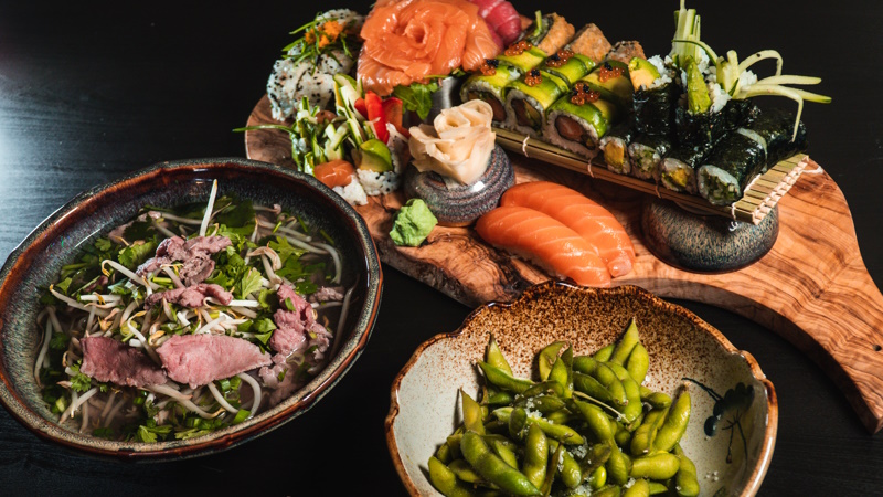 Mit hausgemachter vietnamesischer Brühe, die mit Kräutern, Sojasprossen und Reisbandnudeln serviert wird.